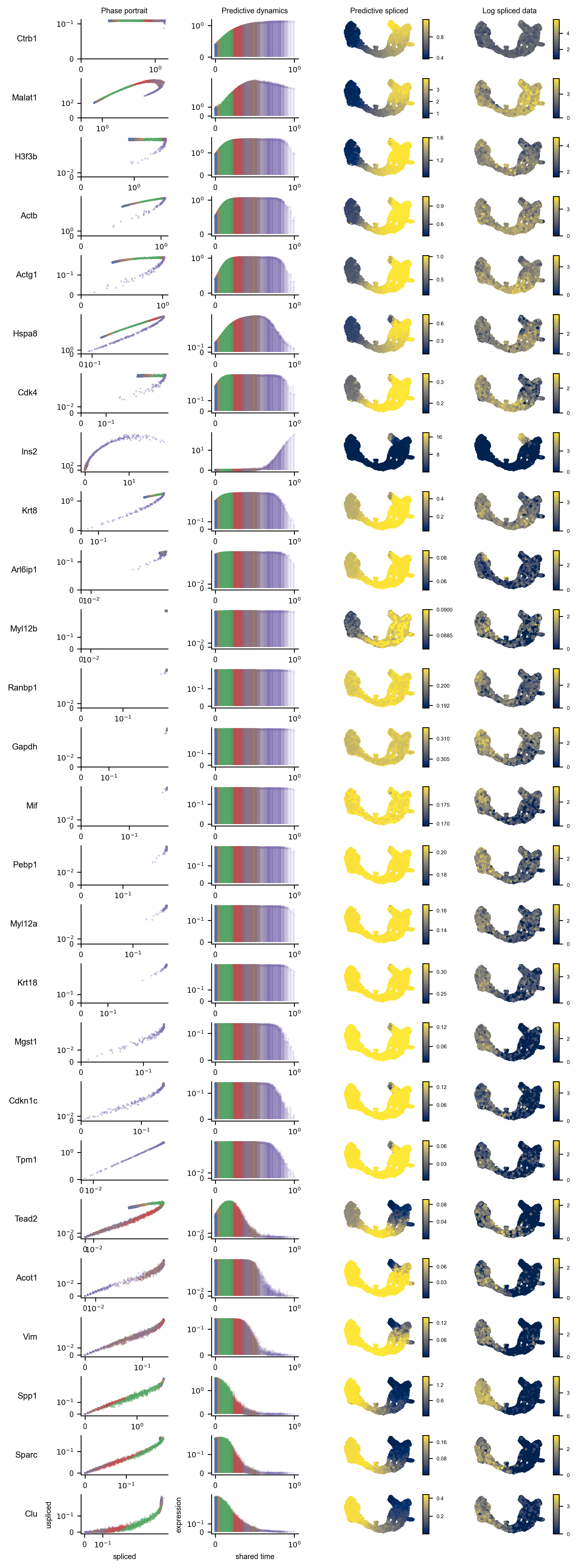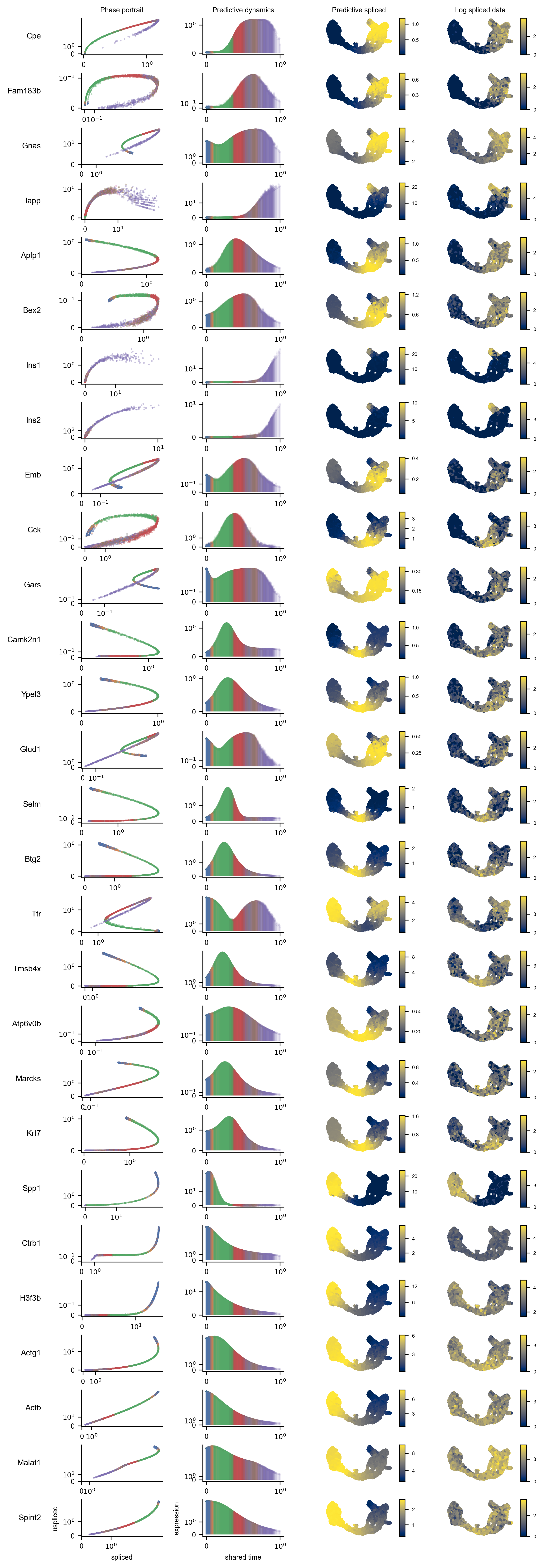 We can attempt to attribute the statistics to underlying features plotting phase portraits, predictive expression, and log-transformed expression of the proposed marker genes